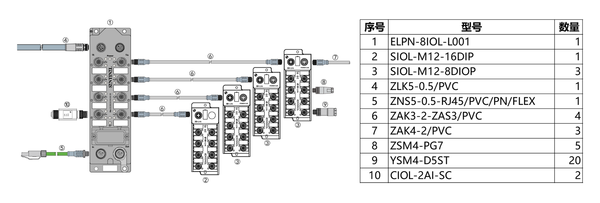 - One IO-Link Master: The core node that centrally manages all signals and communicates with the upper-level PLC.